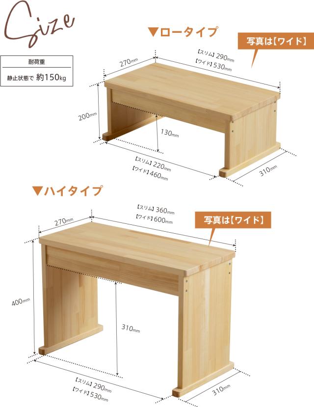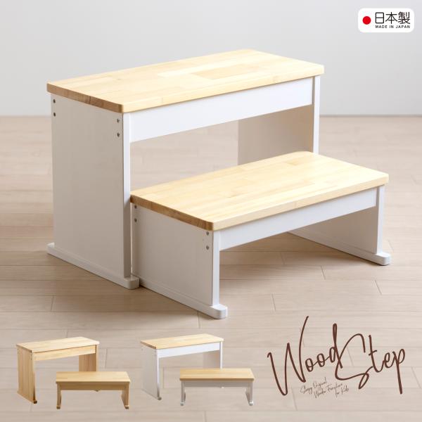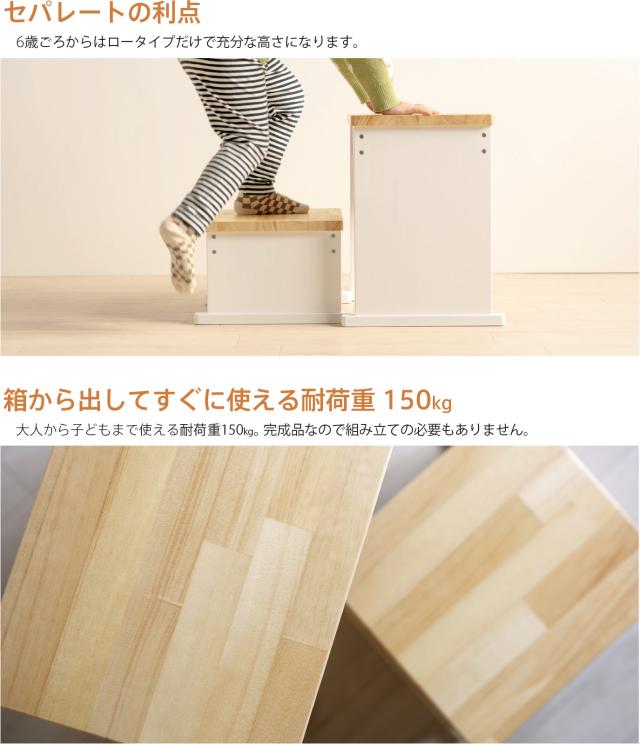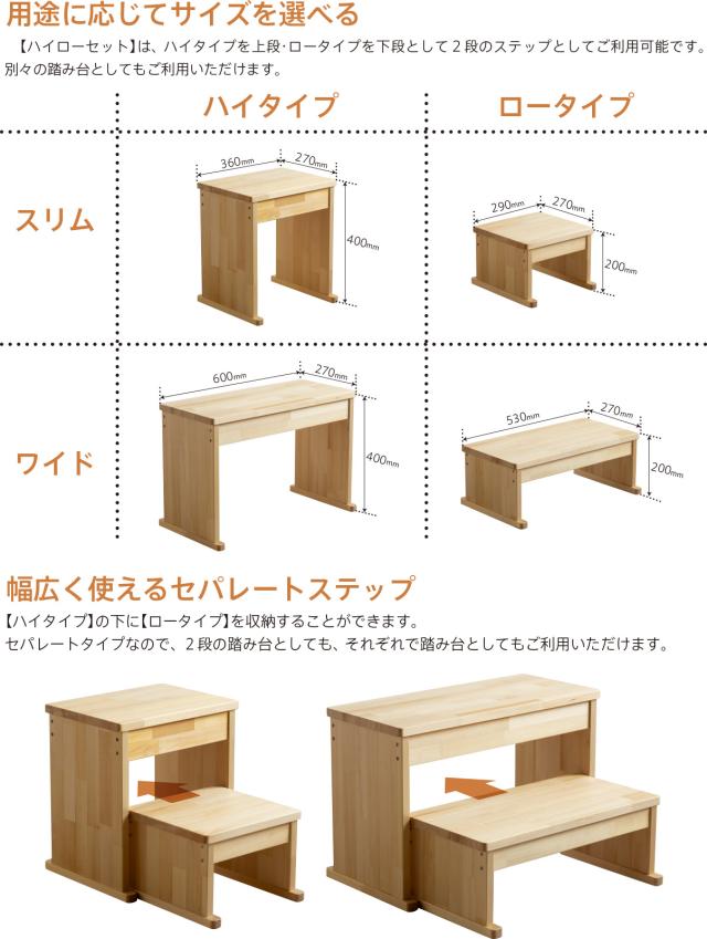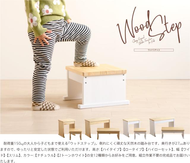 耐荷重150kgの大人から子どもまで使える『ウッドステップ』。倒れにくく頑丈な天然木の踏み台です。奥行きが27cmありますので、ゆったりと安定した状態でご利用いただけます。高さ:【ハイタイプ】・【ロータイプ】・【ハイローセット】、幅:【ワイド】・【スリム】、カラー:【ナチュラル】・【2トーンホワイト】の全12種類からお好みをご用意。組立作業不要の完成品でお届けいたします。