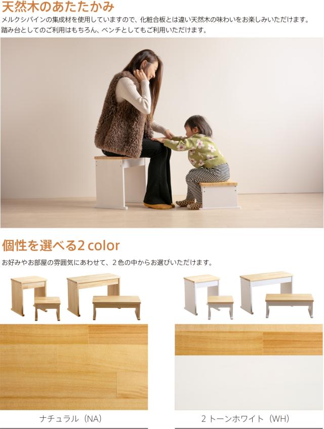 | 特 徴 | 耐荷重150kgの大人から子どもまで使える『ウッドステップ』。倒れにくく頑丈な天然木の踏み台です。奥行きが27cmありますので、ゆったりと安定した状態でご利用いただけます。高さ:【ハイタイプ】・【ロータイプ】・【ハイローセット】、幅:【ワイド】・【スリム】、カラー:【ナチュラル】・【2トーンホワイト】の全12種類からお好みをご用意。組立作業不要の完成品でお届けいたします。 ◎耐荷重は、静止状態で約150kgなので大人の方もご利用いただけます。 ・生産国:日本 ・完成品(滑り止めを使用される方は貼り付けが必要) |
