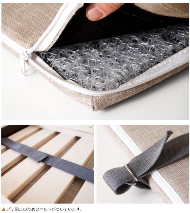 | 特 徴 | ・天然木 ・床板は通気性を考えたスノコ仕様 ・丸脚を外しての使用も可能 ・組み立て式 ・生産国:中国 |