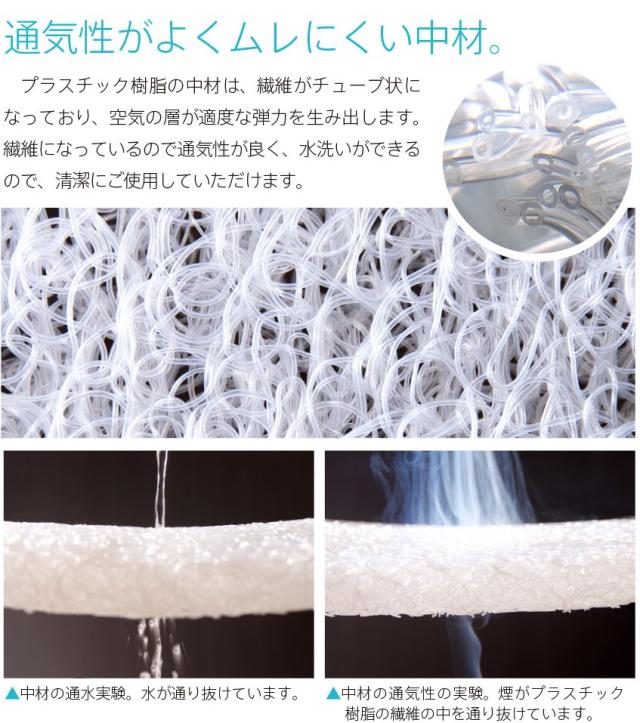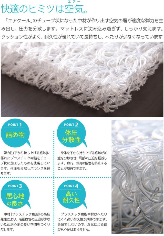また、専用マットレスは、手洗いOKの外カバーと、通気性抜群の中芯“エアクール”を使った快適マットレスです。中芯のチューブ状の繊維が空気の層をつくり、快適空間を生み出します。