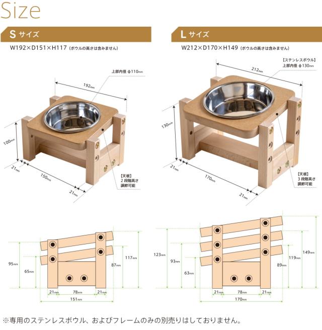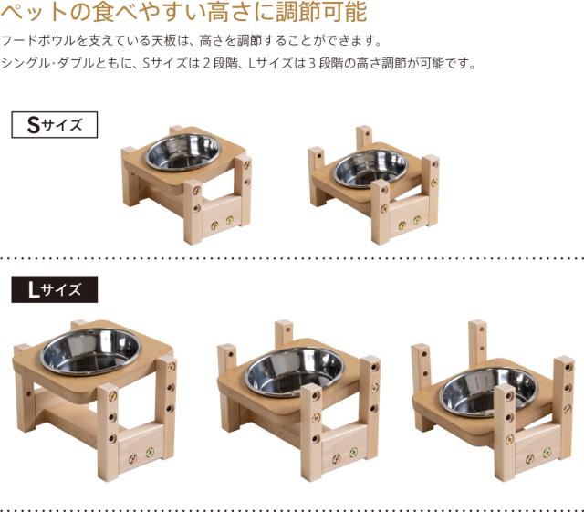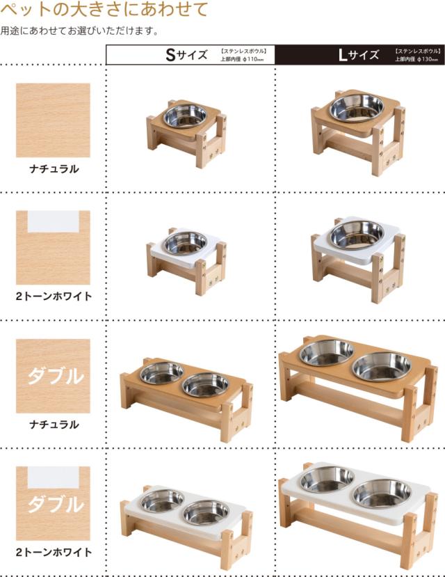 ペットの食事を食べやすい姿勢で快適にするペット用フードボウルスタンド。【Sサイズ】と【Lサイズ】とボウルが2つ載せられる【ダブル・Sサイズ】【ダブル・Lサイズ】の4タイプ、フレームカラーはナチュラル色・2トーンホワイトの2色、。高さ調節が可能なフードボウルスタンドです。