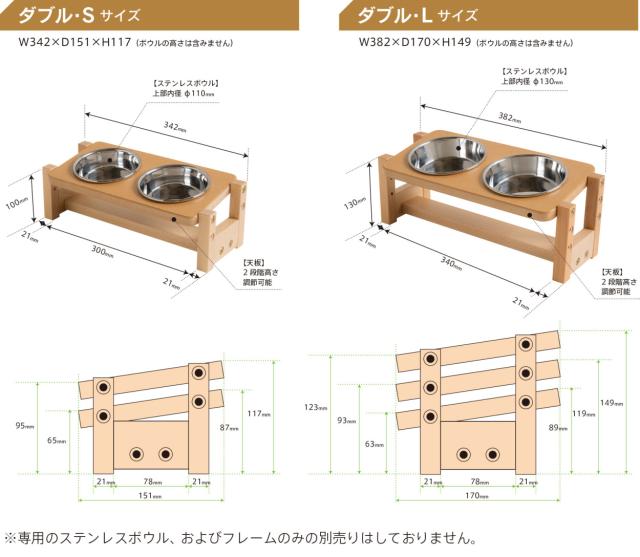 ペットの食事を食べやすい姿勢で快適にするペット用フードボウルスタンド。【Sサイズ】と【Lサイズ】とボウルが2つ載せられる【ダブル・Sサイズ】【ダブル・Lサイズ】の4タイプ、フレームカラーはナチュラル色・2トーンホワイトの2色、。高さ調節が可能なフードボウルスタンドです。