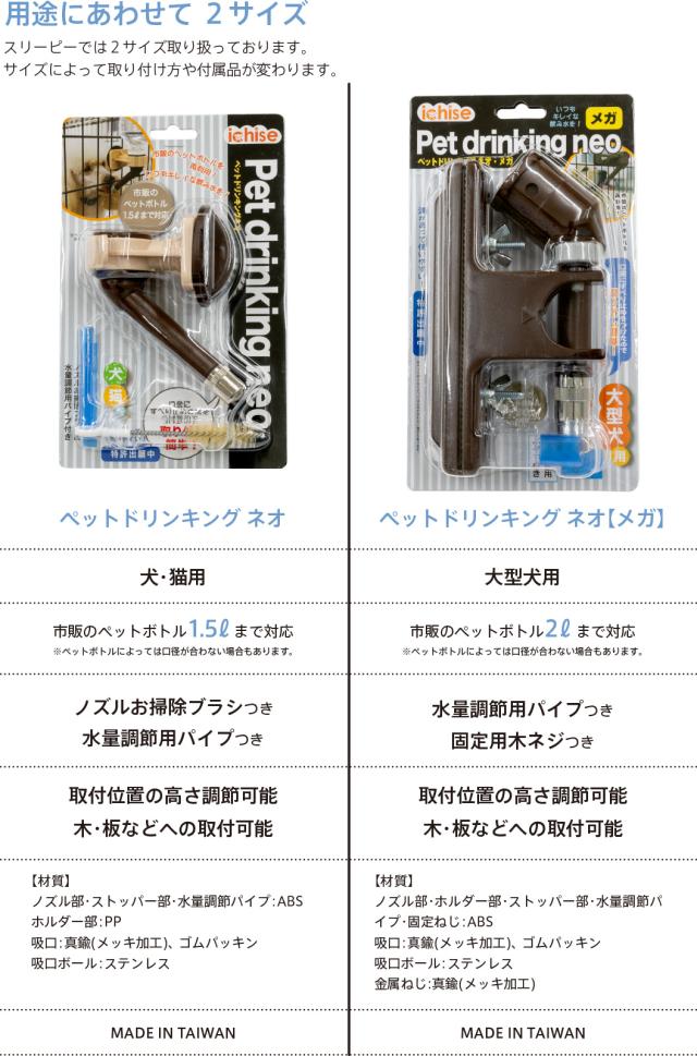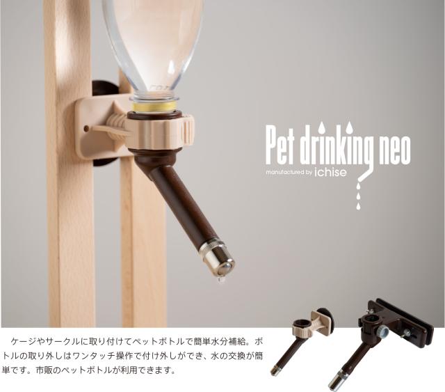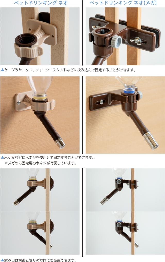 ケージやサークルに取り付けてペットボトルで簡単水分補給。ボトルの取り外しはワンタッチ操作で付け外しができ、水の交換が簡単です。市販のペットボトルが利用できます。 |
