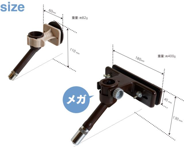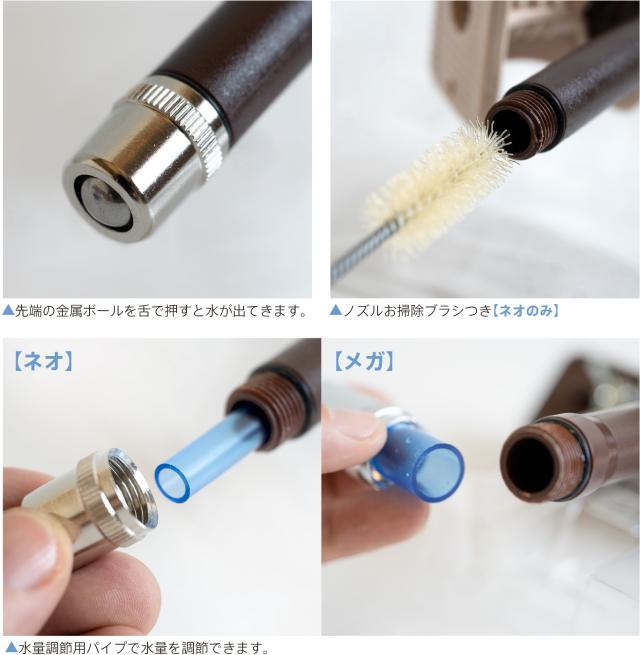 | 主 材 | 【ネオ】 ノズル部・ストッパー部・水量調節パイプ:ABS ホルダー部:PP 吸口:真鍮(メッキ加工)、ゴムパッキン 吸口ボール:ステンレス 【メガ】 ノズル部・ホルダー部・ストッパー部・水量調節パイプ・固定ねじ:ABS 吸口:真鍮(メッキ加工)、ゴムパッキン 吸口ボール:ステンレス 金属ねじ:真鍮(メッキ加工) |
