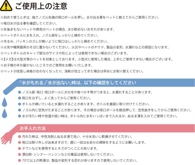 | ご使用上の注意 ※初めて使うときは、指でノズル先端の吸口ボールを押し、水が出る事をペットに教えてからご使用ください。 ※毎日水が出る事を確認してください。 ※生後まもないペットや病気のペットの場合、水が飲めないおそれがあります。 ※ペットボトルに水を入れ、ノズル部をしっかりと締めてください。 ※ゆるみ、パッキンのズレが無いように吸口はしっかりと締めてください。 ※火気や暖房器具のそばに置かないでください。火災やペットのヤケド、製品の変形、水漏れなどの原因になります。 ※ペットボトルのキャップ部分のサイズや形によっては使用できない場合がございます。 ※【メガ】は大型犬等のペットを対象としております。小型犬に使用した場合、上手にご使用できない場合がございます。 ※お子様の手の届かないところでのご使用をお願いいたします。 ※ペットが成長し体格が合わなくなったり、消耗が目立ってきた場合は早めにお取り替えください。 |