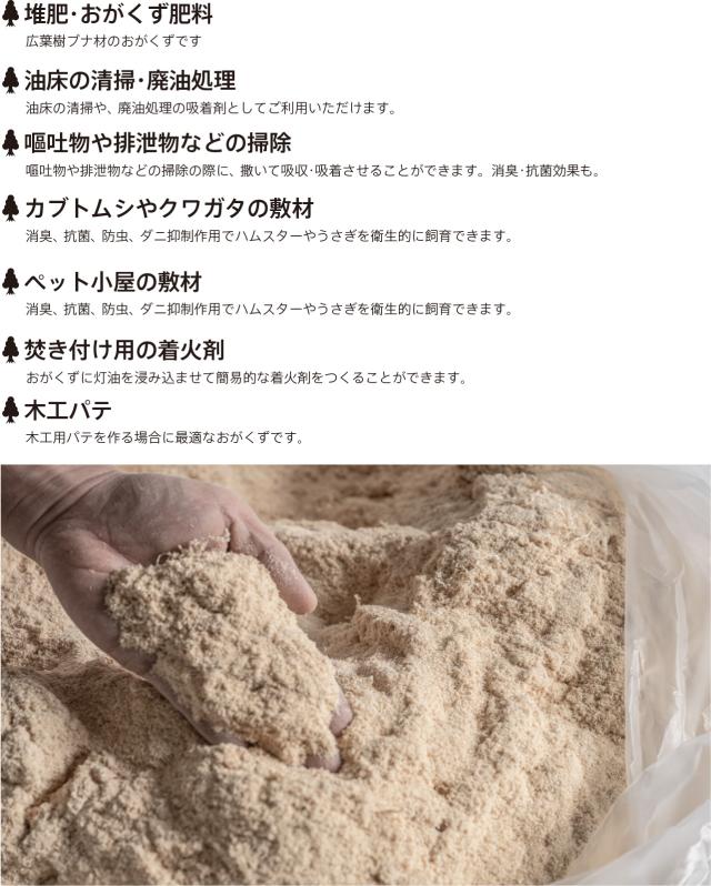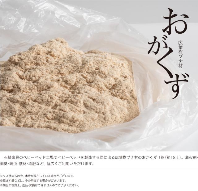 | 特 徴 | 石崎家具のベビーベッド工場でベビーベッドを製造する際に出る広葉樹ブナ材のおがくず 1箱(約18リットル)。着火剤・消臭・防虫・敷材・堆肥など、幅広くご利用いただけます。 ※クズ状のものや、木片が混在している場合がございます。 |