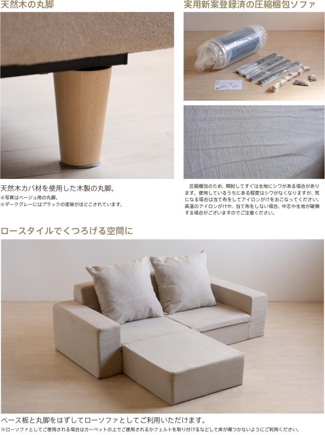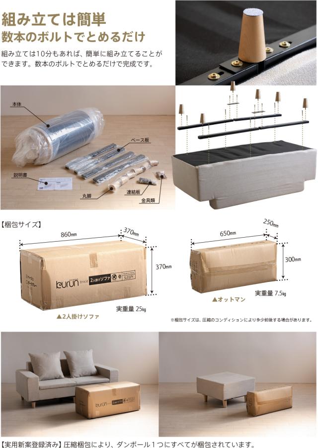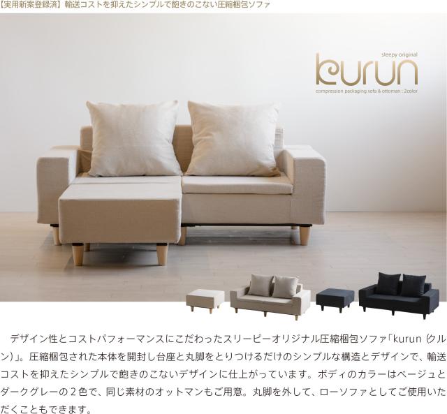 デザイン性とコストパフォーマンスにこだわったスリーピーオリジナル圧縮梱包ソファ「kurun(クルン)」。圧縮梱包された本体を開封し台座と丸脚をとりつけるだけのシンプルな構造とデザインで、輸送コストを抑えたシンプルで飽きのこないデザインに仕上がっています。ボディのカラーはベージュとダークグレーの2色で、同じ素材のオットマンもご用意。丸脚を外して、ローソファとしてご使用いただくこともできます。
