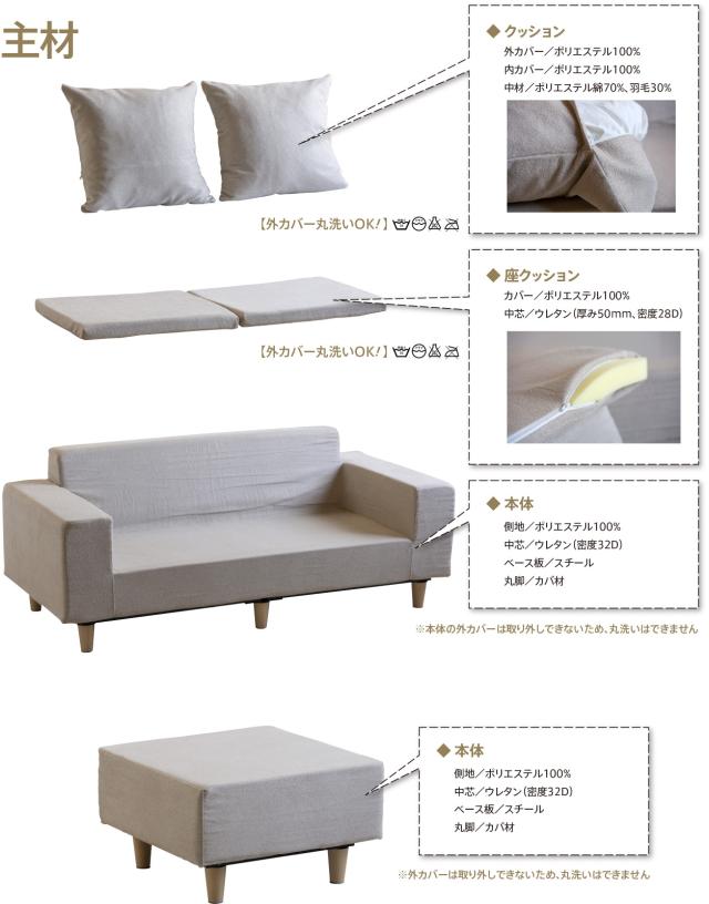 | 主 材 | 【ソファ】 側地/ポリエステル100% 中芯/ウレタン(密度32D) ベース板/スチール 丸脚/カバ材 【ソファ付属クッション】 外カバー/ポリエステル100% 内カバー/ポリエステル100% 中材/ポリエステル綿70%、羽毛30% 【ソファ付属座クッション】 カバー/ポリエステル100% 中芯/ウレタン(厚み50mm、密度28D) |