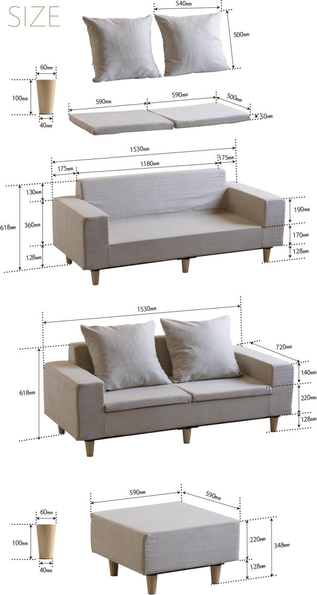 | サイズ | 【2人掛けソファ】 約W1530×D720×H618(SH348)mm ※SH=床から座面までの高さ 重量:約25kg 梱包サイズ:約W860×D370×H370mm |