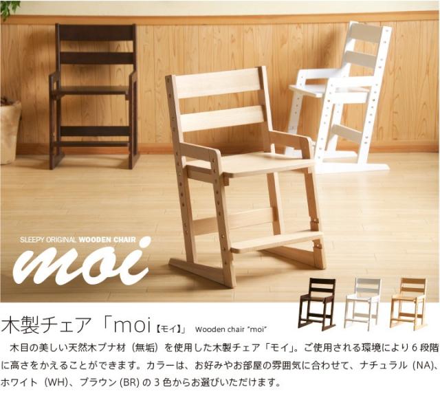 木目の美しい天然木ブナ材(無垢)を使用した木製チェア「モイ」。ご使用される環境により6段階に高さをかえることができます。カラーは、お好みやお部屋の雰囲気に合わせて、ナチュラル(NA)、ホワイト(WH)、ブラウン(BR)の3色からお選びいただけます。
