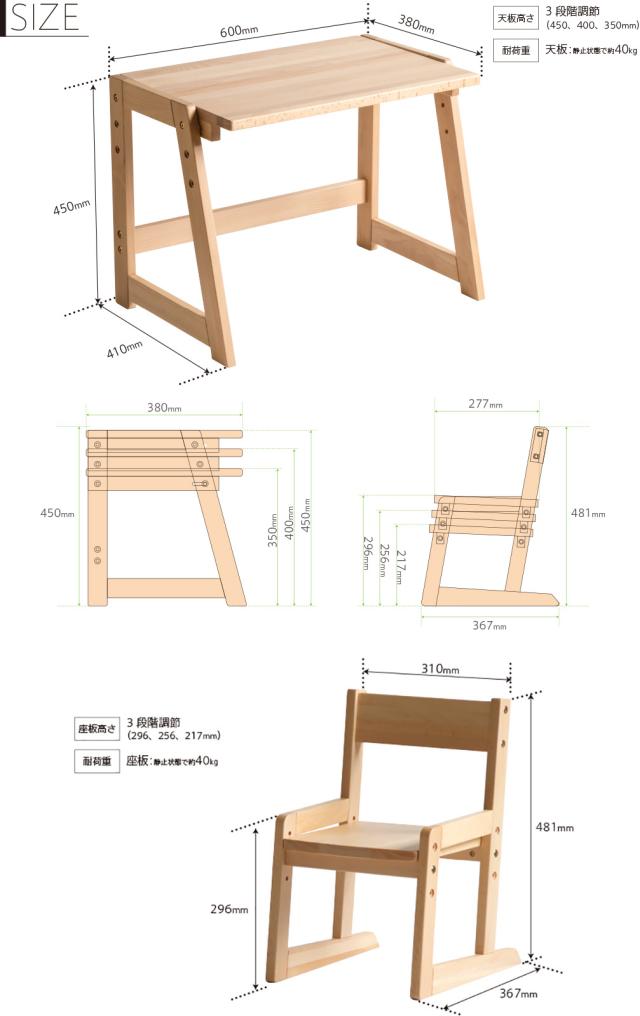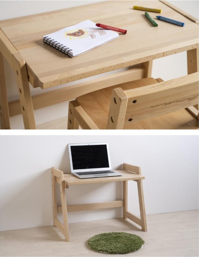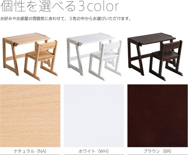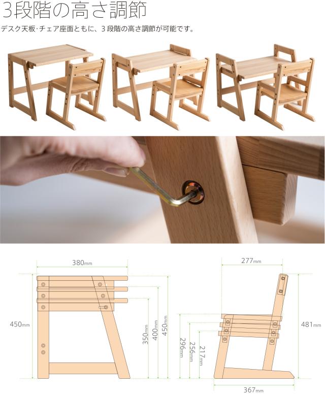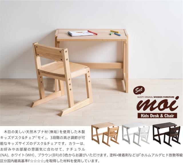 木目の美しい天然木ブナ材(無垢)を使用した木製「モイ」シリーズ。3段階の高さ調節が可能なキッズデスクです。カラーは、お好みやお部屋の雰囲気に合わせて、ナチュラル(NA)、ホワイト(WH)、ブラウン(BR)の3色からお選びいただけます。 塗料・接着剤などは『ホルムアルデヒド放散等級区分国内最高基準F☆☆☆☆』を取得した材料を使用しています。