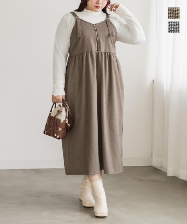 | 3Lサイズを着用して、バストやウエスト周りもちょうどよく、ラインを拾わず楽な着心地でした◎フロントのジップがアクセントになっていて、甘さの中にもモード感をプラスしてくれます♪スカート部分は程よくフレアに広がって、気になるヒップや太ももをしっかりカバー。デザイン性がありながらも1枚でさらっと着られるワンピースなので、コーデに迷わない優秀アイテムです!季節感のある起毛素材と千鳥柄がかわいい!スニーカーを合わせてカジュアルに着崩すのもおすすめです!インナー次第で雰囲気や季節感も変えて楽しめるワンピースです。 |