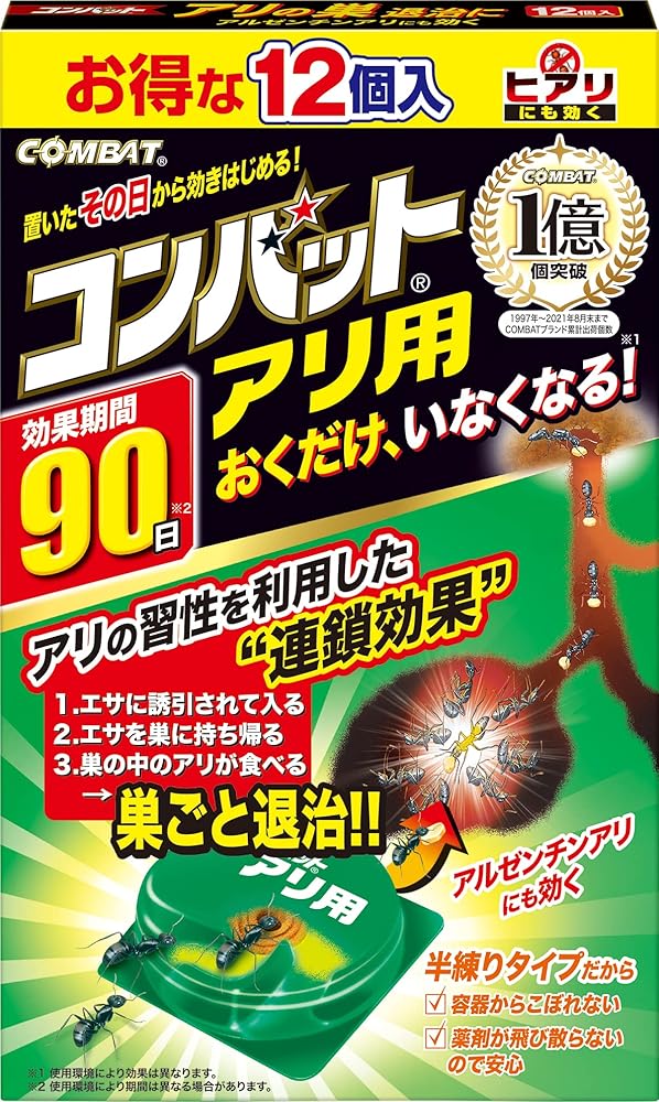 | 商品の説明 | 商品紹介 置くだけでアリを巣ごと退治。アルゼンチンアリ・ヒアリにも効きます。 アリの習性を利用した【連鎖効果】 1.エサに誘引されて入る 2.エサを巣に持ち帰る 3.巣の中のアリが食べる 巣ごと退治。。 ・半練りタイプだから、容器からこぼれず、薬剤が飛び散らないので安心。 ・あちこち置ける12個入。 ・エサは容器の中にセットされているので、そのまま置くだけ。 ・固定テープ付きで、縦にも貼れます。 ・プロが使うフィプロニル配合で、置いたその日から効きはじめる。 【適用害虫】アリ・ヒアリ・アルゼンチンアリ 原材料・成分 フィプロニル ご注意(免責)>必ずお読みください ご注意(免責)> 必ずお読み下さい 在庫完売の際は、お取寄せ又はキャンセルとなる場合がございます。また、Amazon配送予定日と弊社商品お届け予定日は異なる場合もございますので予めご了承下さい。 商品は予告なくパッケージ変更の場合もあります。※お客様都合によるご返品はお受けできません |