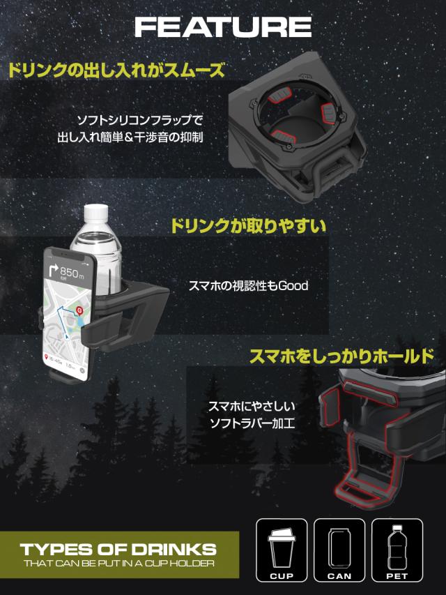 ・スマホホルダーは、ドリンクの出し入れを妨げないローポジション設計です。