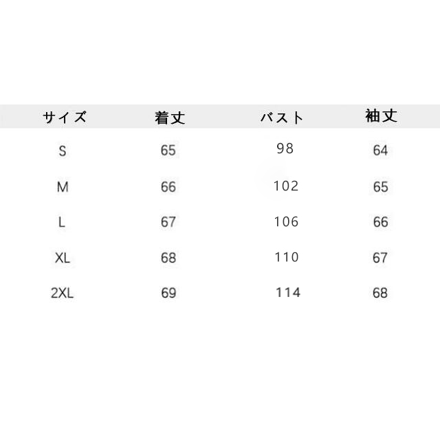 | サイズについての説明 | サイズ 着丈 バスト 袖丈 ※サイズ表の実寸法は商品によって1-3cm程度の誤差がある場合がございます。 |