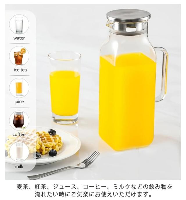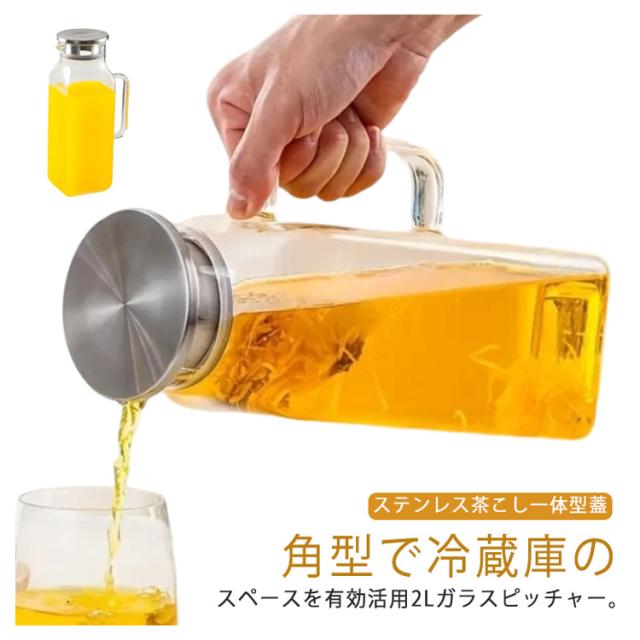 | 角型で冷蔵庫のスペースを有効活用2Lガラスピッチャー。【ステンレス茶こし一体型蓋】 ボトルの口径が大きく、手が直接差し込めて清潔できます 麦茶、紅茶、ジュース、コーヒー、ミルクなどの飲み物を淹れたい時にご気楽にお使えいただけます。-20℃〜150℃、耐熱ガラスので、温かい飲み物にも冷たい飲み物にも使える耐熱ガラス製のピッチャーです 角型のサーバーは冷蔵庫に収納した際にムダなくスッキリみせてくれます。 | |