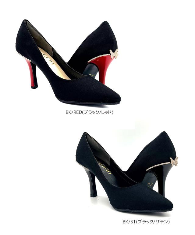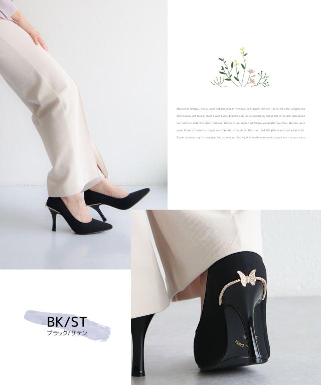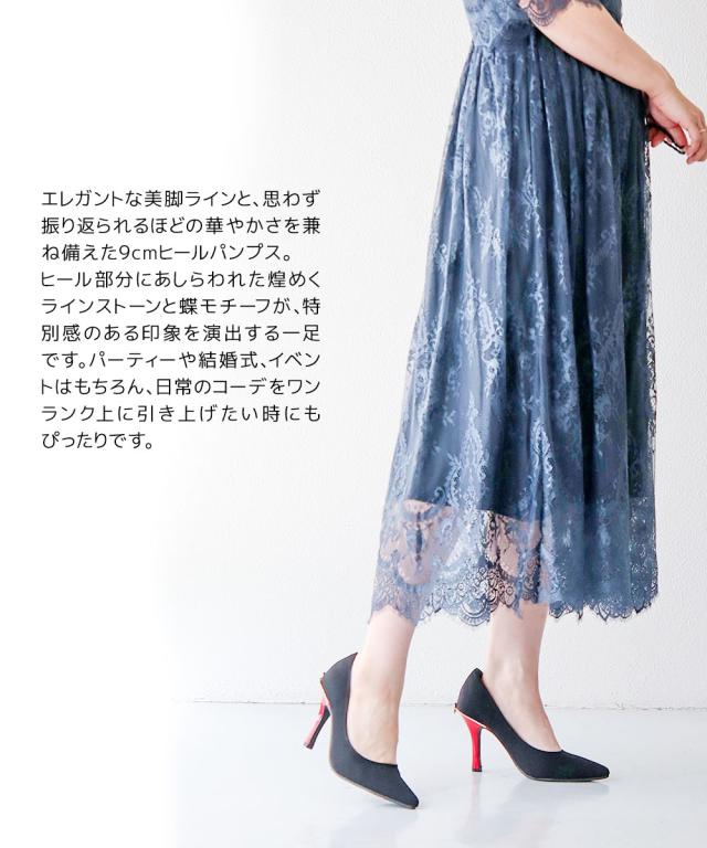 パンプス レディース 9cm ヒール ポインテッドトゥ ラインストーン 蝶モチーフ かかと抜け防止 クッション 歩きやすい 美脚 上品 オケージョン お呼ばれ パーティー きれいめ ブラック レッド 22 25cm 8133
