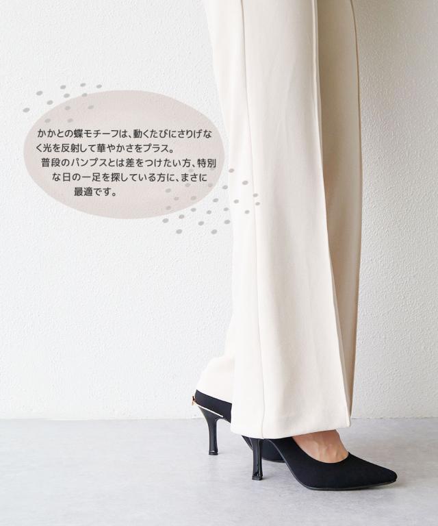 ヒール部分にあしらわれた煌めくラインストーンと蝶モチーフが、特別感のある印象を演出する一足です。パーティーや結婚式、イベントはもちろん、日常のコーデをワンランク上に引き上げたい時にもぴったりです。