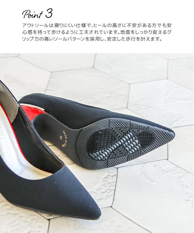 アウトソールは滑りにくい仕様で、ヒールの高さに不安がある方でも安心感を持って歩けるように工夫されています。