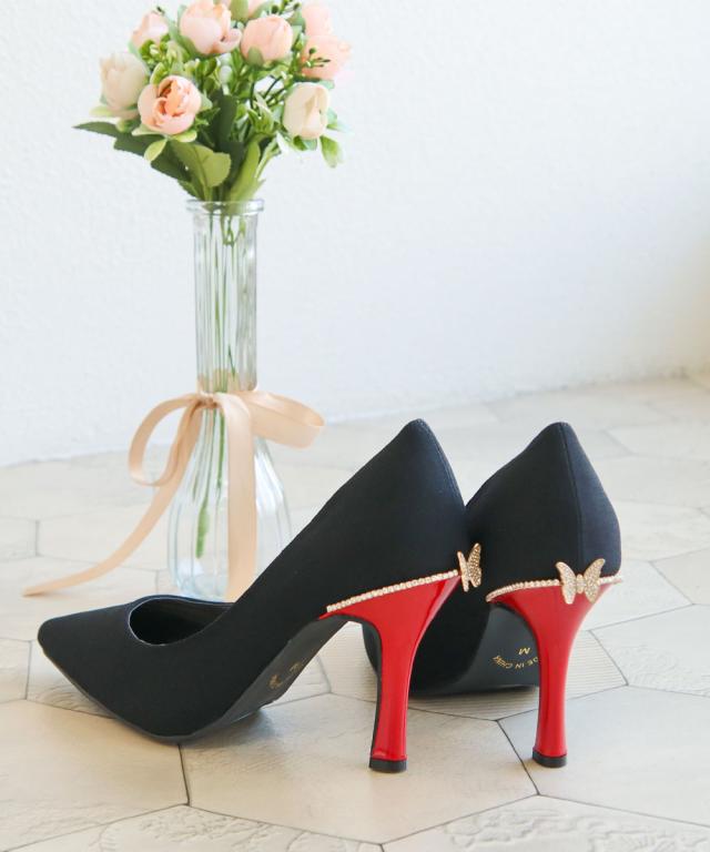パンプス レディース 9cmヒール ポインテッドトゥ ラインストーン 蝶モチーフ 美脚パンプス 歩きやすいパンプス 痛くないパンプス 黒パンプス フォーマルパンプス パーティーパンプス 結婚式パンプス ステージパンプス ヒールパンプス クッションインソール かかと抜け防止 スタイリッシュパンプス ブラックパンプス レッドヒール