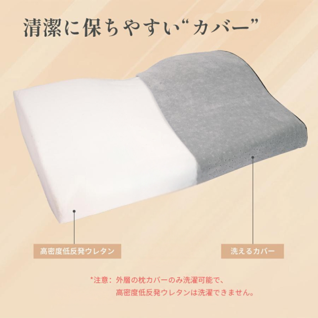 首・肩にフィットする独自構造で、横向き・仰向け・うつぶせ、どんな姿勢でもしっかり安定。(1) 首・肩の負担を軽減する設計中央のくぼみが頭を安定させ、アーチ型のネックラインが首元にぴったりフィット。自然なカーブを保てるので、正しい姿勢で眠れ、寝違えを防止します。(2) 横向き寝派も大満足の構造両サイドを少し高くすることで、横向きでも首・肩・頭がまっすぐに保たれ、気道が広がって呼吸もスムーズ。(3) 寝返りがしやすいカーブ構造肩に沿った緩やかなラインが、スムーズな寝返りをサポート。深い眠りを妨げず、自然な動きができるのがポイントです。(4) 低反発ウレタンで快適な寝心地しっとりした弾力のある低反発ウレタンが、頭圧をやさしく分散。絶妙なバランスで体への負担を軽減します。(5) 通気性も◎ 清潔さをキープ通気?