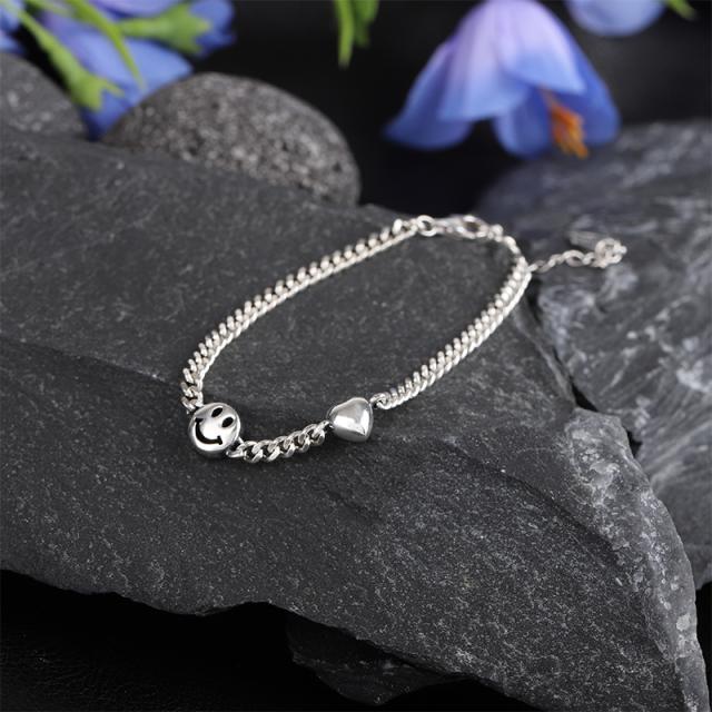 スマイルとハートのモチーフが愛らしく揺れる、シルバーチェーンブレスレット。
