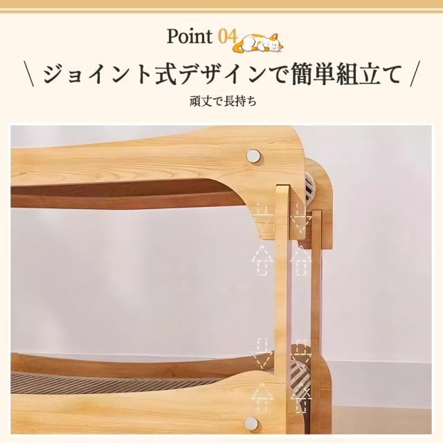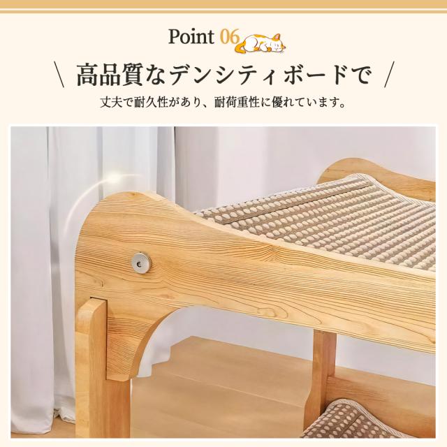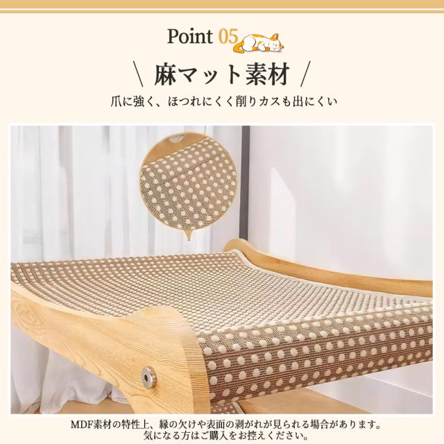 MDF素材の特性上、製造過程で微細な緑の欠けや表面のわずかな剥がれが生じることがあります。気になる方はご購入をお控えください。 定期的に全体の緩みがないか確認し、必要に応じてネジを締め直してください。 猫ちゃんが激しく飛びついたりすることで、経年によりゆるみや損傷が生じる可能性があります。異常を感じた際はご使用を中止してください。 |