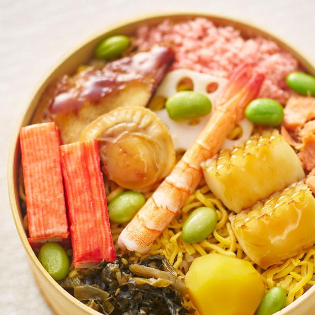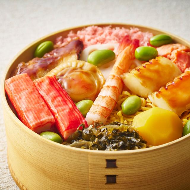 刻み穴子にゆず、かんぴょう、しいたけ、きくらげなど、7種の具材を混ぜ合わせた茶きん鮨の混ぜシャリを使った贅沢なちらしずし。