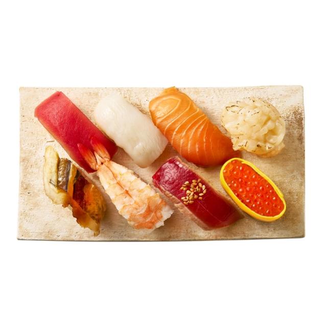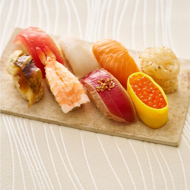 まぐろ・イカ・生サーモン・炙り帆立昆布〆・煮穴子・海老・漬けまぐろ・いくら錦糸巻の8貫入ったにぎり寿司です。