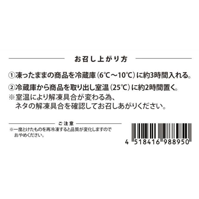 ■まぐろ・イカ・生サーモン・炙り帆立昆布〆・煮穴子・海老・漬けまぐろ・いくら錦糸巻の8貫入ったにぎり寿司です。