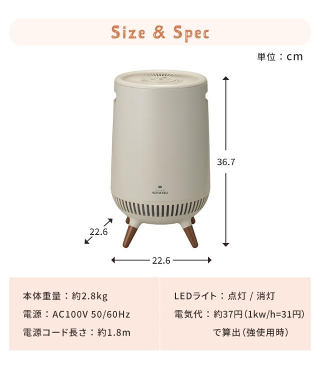 | テーブル下に置くだけで「どこでもこたつ」になるスポットヒーター。 ご家庭のダイニングテーブルが、布団のないこたつへ早替わり。 エアコンの温風が届きにくいテーブルや机の下で、本体下部の吹出口から360°全方位に温風が広がり、 足元をあたためます。 本体下部の吹出口に暖色系LEDを搭載しており、暗い足元をあたたかく照らします。 付属の薄型リモコンでテーブルの下をのぞき込んだり、かがむ姿勢をとることなく電源を入れることができます。 チャイルドロック、6時間自動電源オフ、 転倒時自動オフなど、小さなお子様やペットがいるご家庭でも安心してご使用いただける 機能が充実。 |