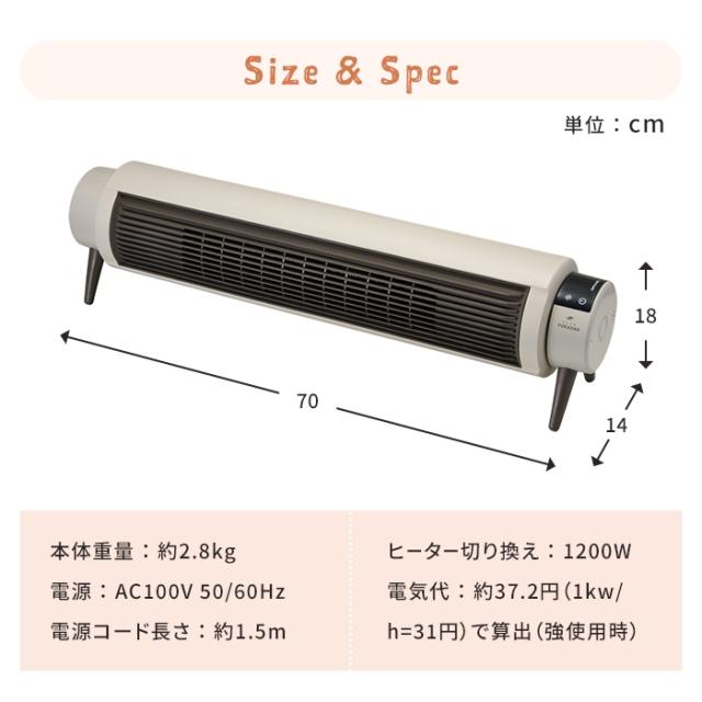 | ・ リモコン電源オン ・ スイング3モード(床暖/衣類/ワイド) ・ ヒーター切換:1200W ・ OFFタイマー:1/2/4/6時間 ・ 送風切替 ・ チャイルドロック ・ 転倒時自動OFF ・ 電気代:約37.2円(1kw/h=31円)で算出(強使用時) |