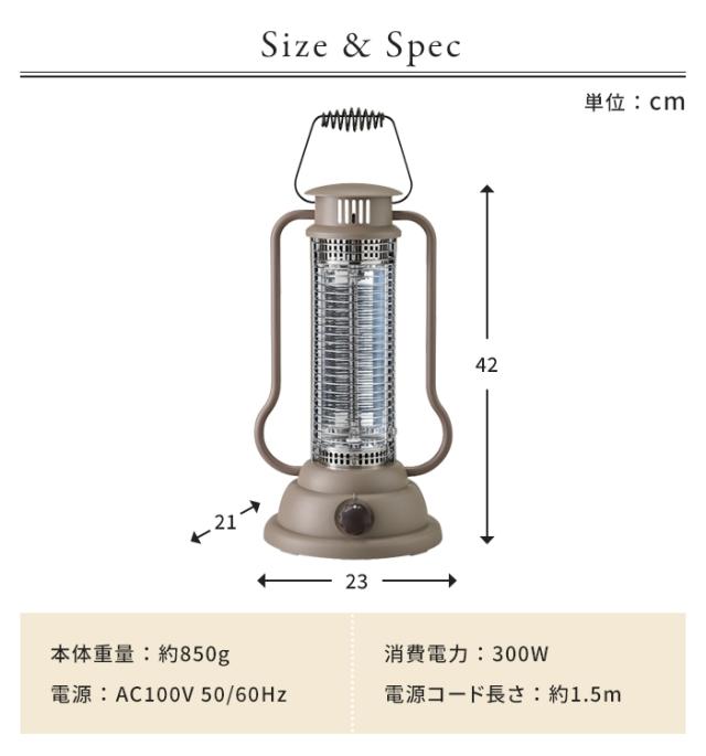 | 持ち運びやすく使いやすい、しかも省電力でもしっかりあたたかい、ランタン型のカーボンヒーター。 熱効率の高いスパイラルカーボンヒーターを搭載し、立ち上がりが早く、スポット暖房に最適。 本体重量も0.85kgと軽量で、ハンドルもついているので、持ち運びラクラク。 また、持ち運びのことを考え、電源コードは衝撃に強くて丈夫キャブタイヤコードにすることでより安心して様々な場所でご使用いただけます。 さらに消費電力も300Wとヒーターとしては省電力に抑える事で、ポータブル電源やハイブリッド車・電気自動車など様々な電源などからでも使いやすい仕様となっています。 屋内はもちろん、テラスやキャンピングカー、レジャー、災害時など様々なシーンで活躍します。 |
