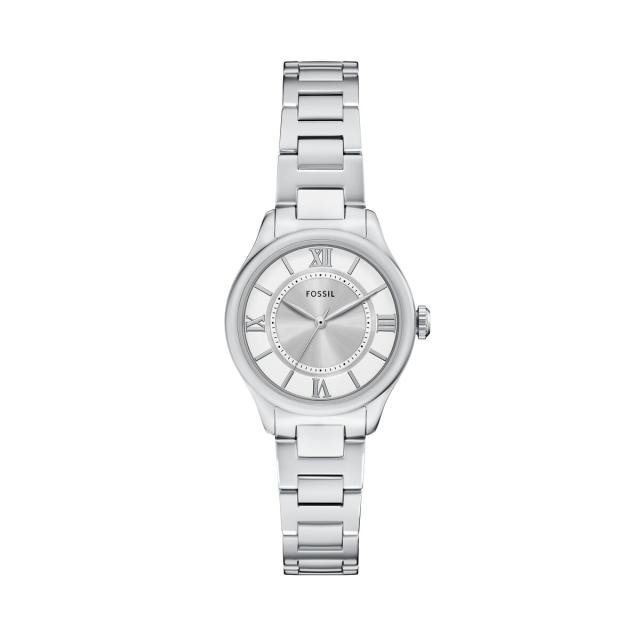 シルバートーンのステンレススチールを全体に使用したこのウォッチは、洗練されたモノトーンのラウンドケースとマッチするブレスレットを組み合わせています。
