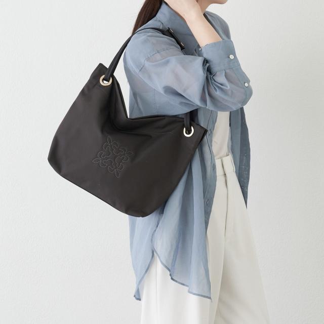 上質なナイロン素材にモノグラム刺繍をあしらった、ラシットらしいデザイン性と機能性を兼ね備えたトートバッグ。