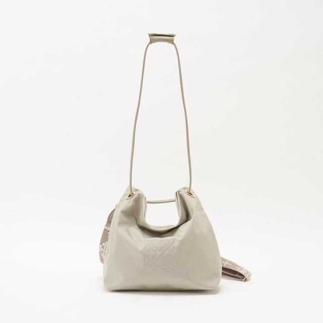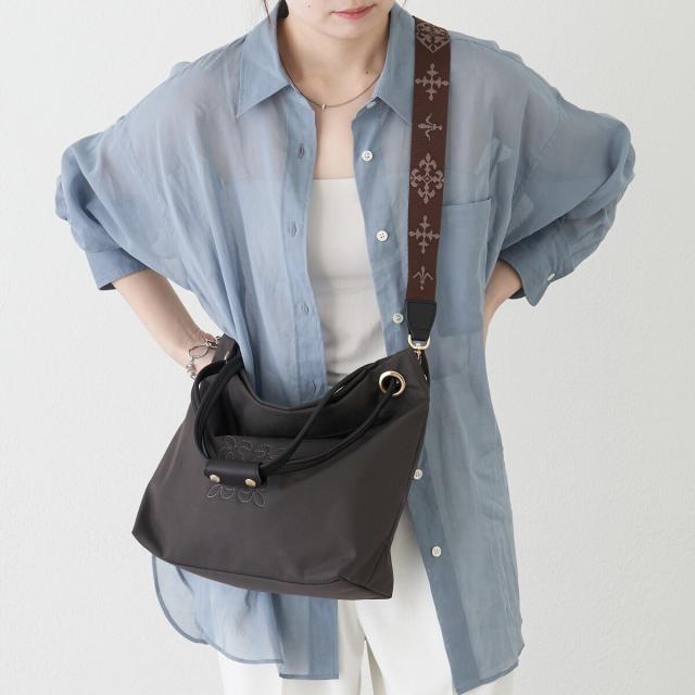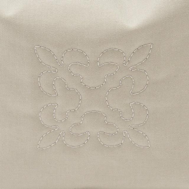 従来のひし形配置ではなく四角いグリッド状に施すことで、バッグ上部をくしゅっとさせても刺繍の美しさが際立つよう仕立てています。