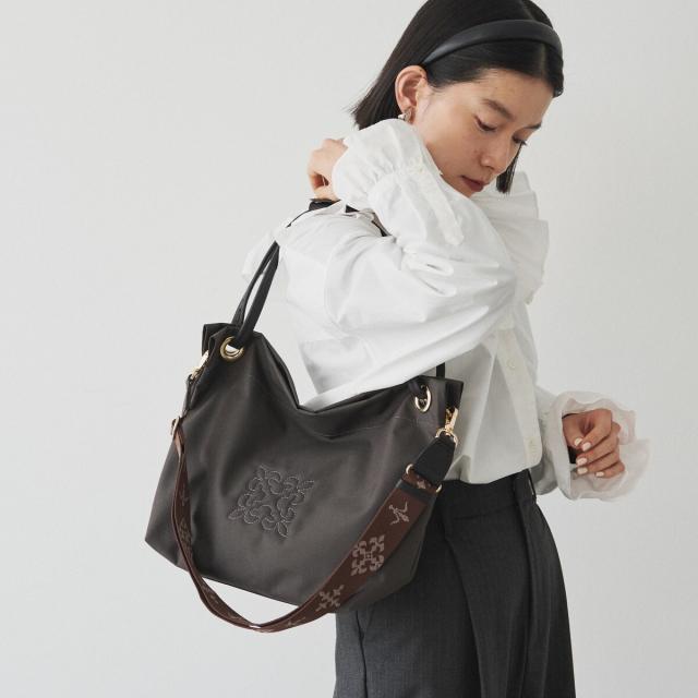 ・人気のモノグラム刺繍をバッグ中央に配し、デザインのアクセントに
