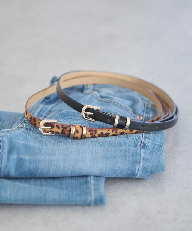 コーディネートのアクセントに最適なベルト。細めのフォルムが上品でスタイリッシュな着こなしを演出します。きらりと輝くダブルのメタルカンが女性らしい雰囲気を演出。ボトムにはもちろん、大きめのシャツやカーディガンの上から巻くトレンドスタイルもおすすめです。※モデル着用画像は、光の当たり具合で色味が違って見える場合がございます。※お使いのモニター環境によって商品の色味が違って見える場合がございます。