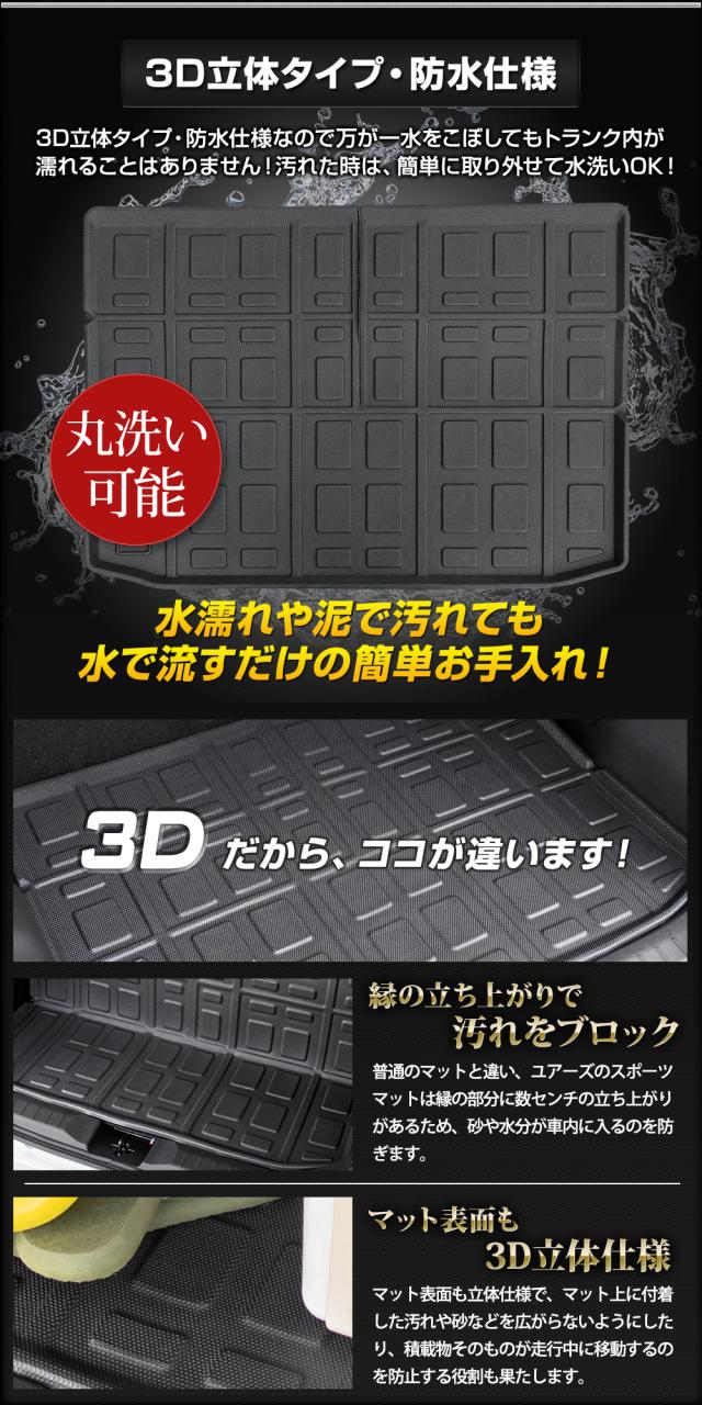 車種専用なので隅々までぴったりフィット! 経験豊富な専任のスタッフが一から製作しているので、他社製品にはないデザインと仕上がりをお届けします。 本品は置くだけだけの簡単設置で汚れや傷からトランク内を保護します。 3Dの立体デザインで縁部分は数センチの立ち上がりがあるので水や汚れをしっかりキャッチ! 完全防水なのでお手入れも簡単! 水や汚れは軽いものならウエスなどで拭くだけでOK! 全面的に汚れた場合は丸洗いも可能なので衛生的です。 新素材の熱可塑性エラストマー(TPE)を使用。 弾力があり、曲げたりすることも可能なので、お車からの取り外しも容易です。 |