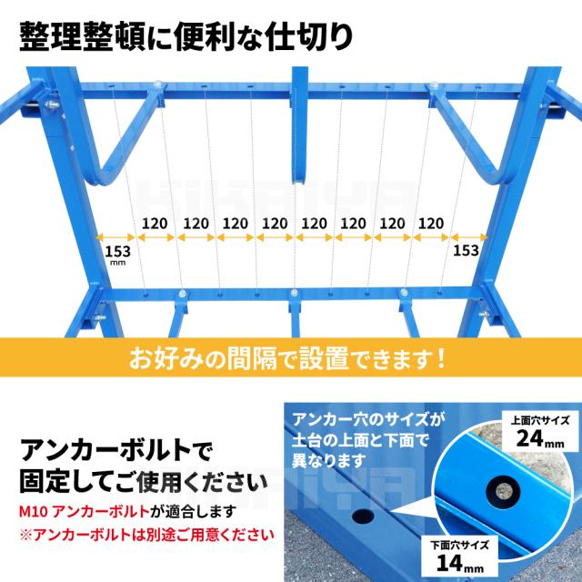 長尺物の保管スペースをコンパクトに! ●パイプ、木材等の長尺物の整理整頓に最適です ●底面は奥に向けて傾斜がついているので、立て掛けたものが手前に倒れづらくなっています ●長尺物が転倒するのを防ぐチェーン付き ●仕切りは120mm間隔でお好みの位置に設置できます ●アンカーボルトで固定してご使用ください ※アンカーボルトは付属しません。別途ご用意ください ●複数台を組み合わせてご使用いただくことも可能です ●お客様自身で組み立てが必要な商品です 安全のため、2〜3人での組み立てを推奨いたします 必要工具:プラスドライバー、インパクトレンチ(19mm) 品番:TKR-1 |