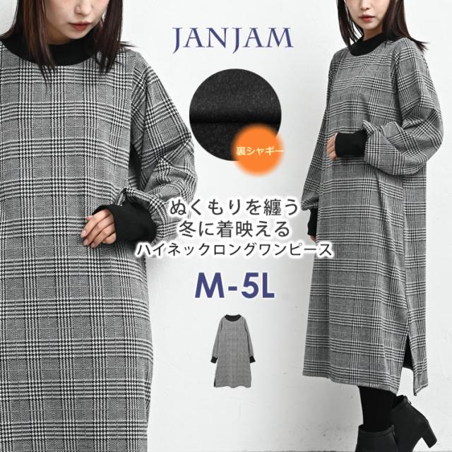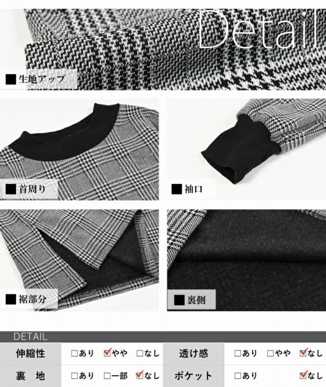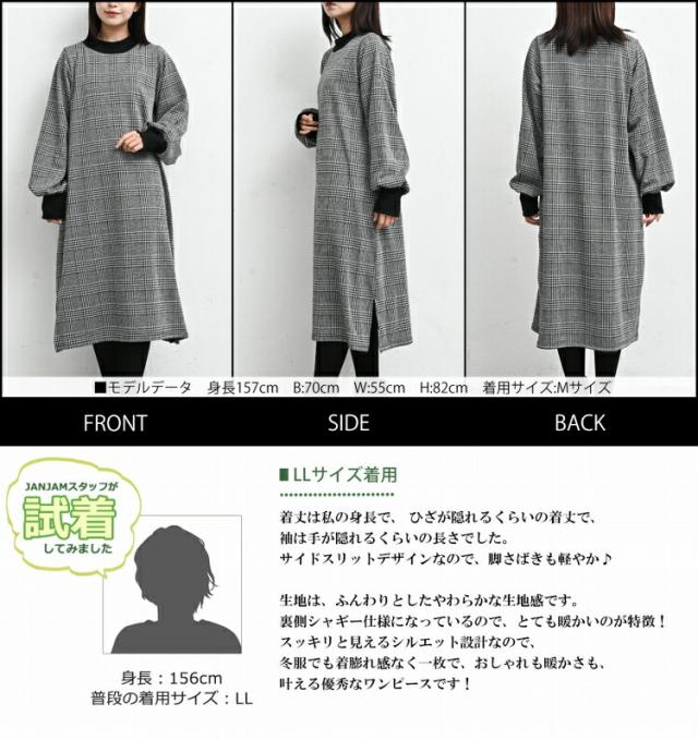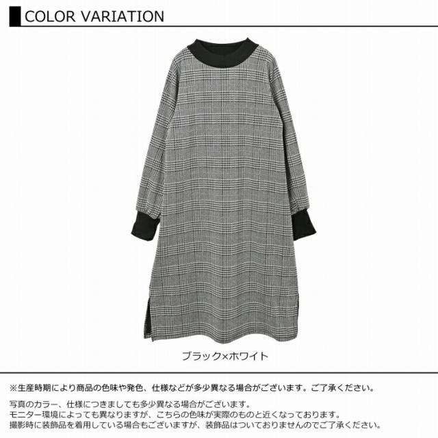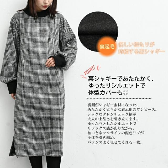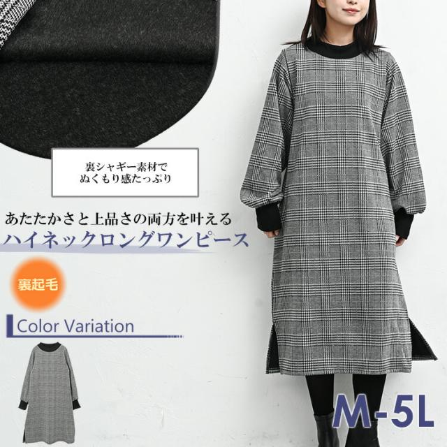送料無料※沖縄/北海道対象外 大きいサイズ レディース ハイネックワンピース ロング丈 長袖 グレンチェック柄 サイドスリット 裏シャギー あったか裏起毛 M/LL/3L/4L/5L ゆったりサイズ ぽっちゃり女子 プラスサイズ