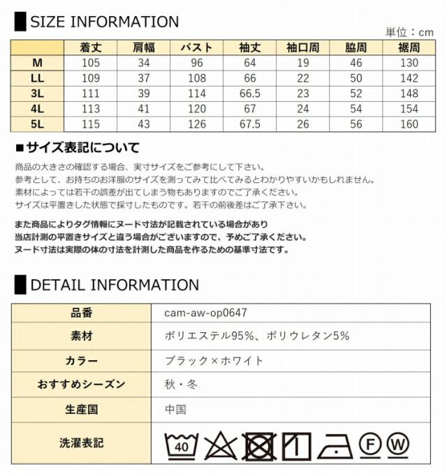5L:着丈115 肩幅43 バスト126 袖丈67.5 袖口周26 脇周56 裾周160