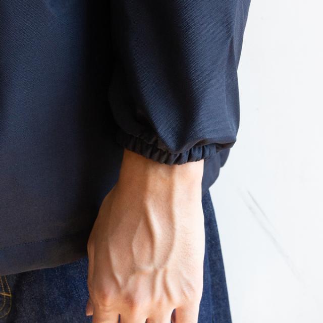 はっ水加工を施したナイロンオックス生地は適度な厚みで、ヘリテイジ感のあるマットな質感が特徴です。裏地は軽く着心地のよい起毛トリコット生地。フロントのドットボタンは、開衿で着用しても襟の形が美しい位置に配置しています。