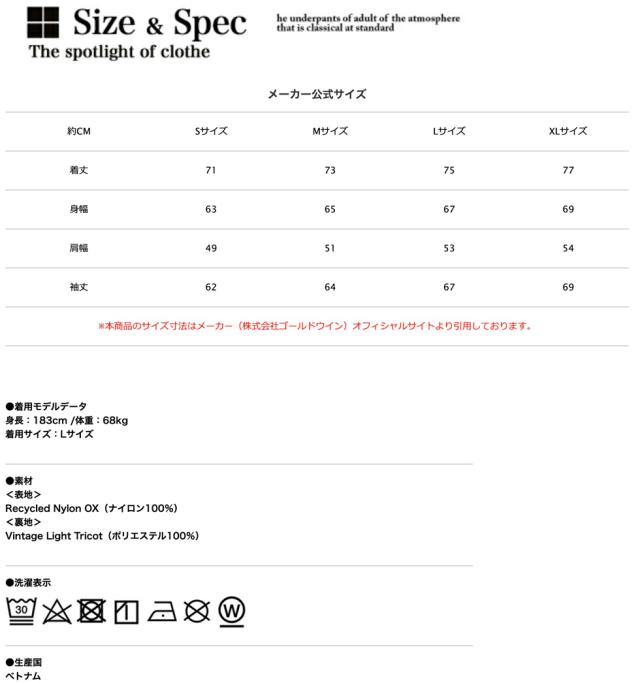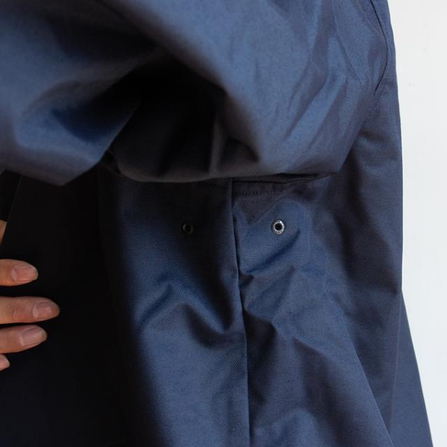 はっ水加工を施したナイロンオックス生地は適度な厚みで、ヘリテイジ感のあるマットな質感が特徴です。裏地は軽く着心地のよい起毛トリコット生地。フロントのドットボタンは、開衿で着用しても襟の形が美しい位置に配置しています。 |