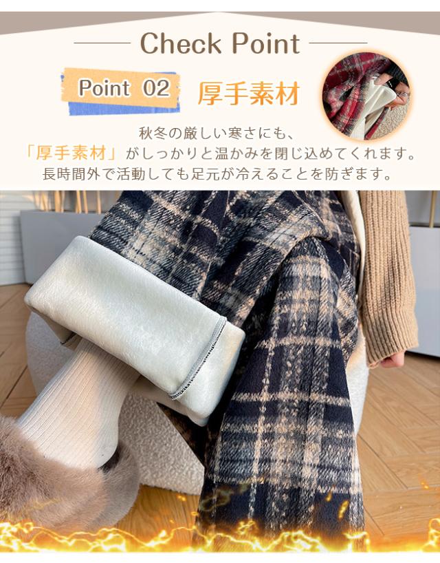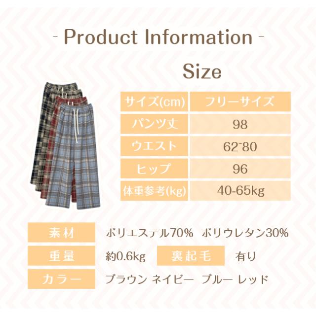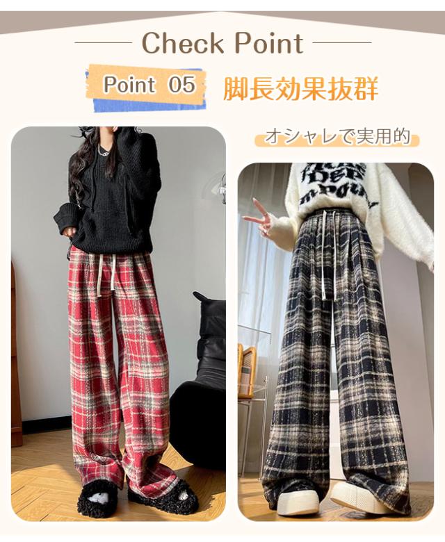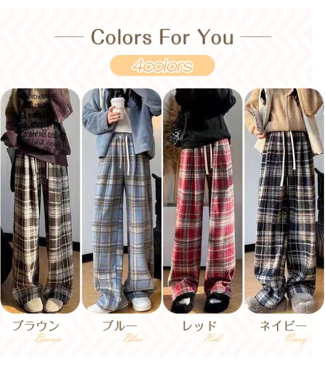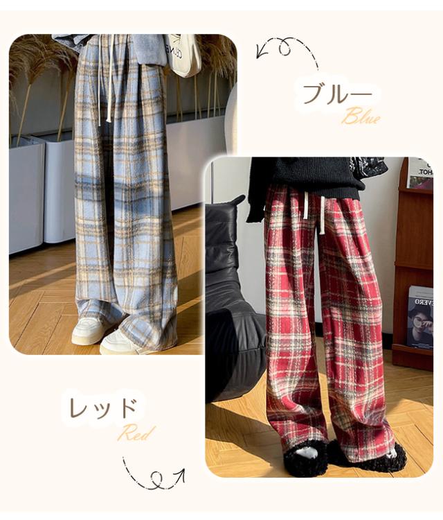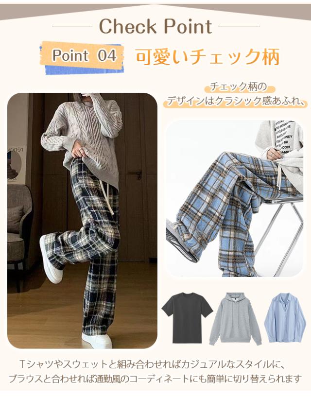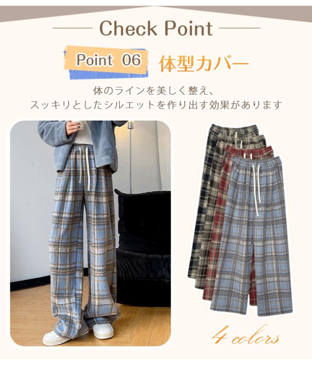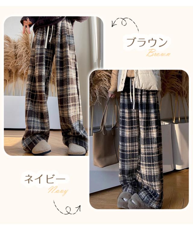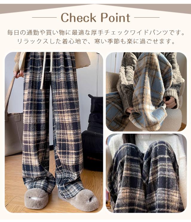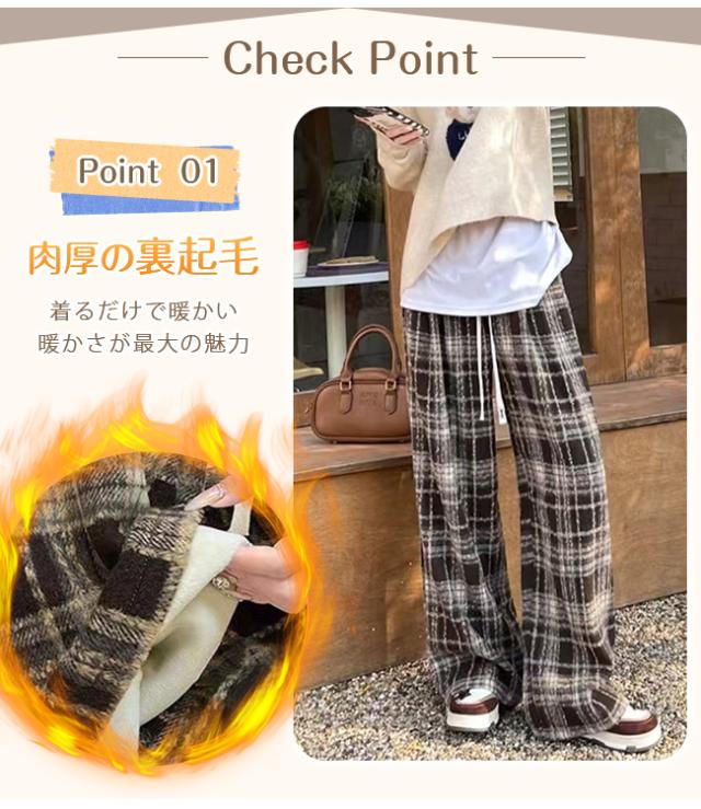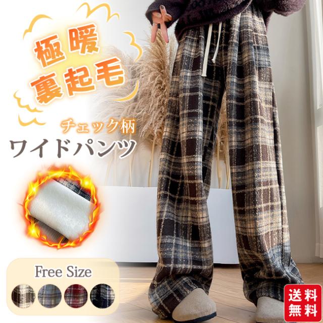 【50 円 OFFクーポン】新作 裏起毛 ワイドパンツ チェック柄パンツ レディース 秋 冬 ボトムス ロング丈 ウエストゴム 可愛い ゆったり ズボン ロングパンツ カジュアル 体型カバー 防寒 暖かい