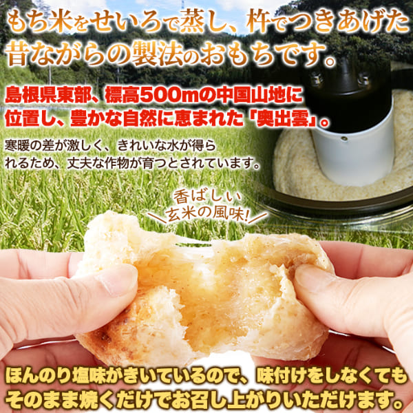 もち米をせいろで蒸し、杵でつきあげた昔ながらの製法のおもちです。島根県東部、標高500mの中国山地に位置し、豊かな自然に恵まれた「奥出雲」。寒暖の差が激しく、きれいな水が得られるため、丈夫な作物が育つとされています。香ばしい玄米の風味!ほんのり塩味がきいているので、味付けをしなくてもそのまま焼くだけでお召し上がりいただけます。真空パック包装でお届けします。■香ばしい玄米の香りとつぶつぶ食感が美味しい!ほんのり塩味がたまらない、島根県・奥出雲産のもち米を玄米のままおもちに。■素朴な風味の優しいおもち!ほんのり塩味で、玄米が苦手な方にもおすすめ。島根県産もち米100%使用杵つき玄米もち。【注意事項】※脱酸素剤は食べられませんので、ご注意ください。※保存料は使用しておりませんので開封後は冷蔵庫(10℃以下)で保存し、なるべくお早めにお召し上がり下さい。※外気との温度差により袋の内側に水滴がつくことがありますが、品質上問題ありません。※予告なく外装や形・並べ方が変わることもございます。ご了承ください。
