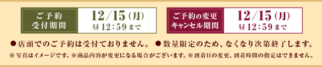 ● ご予約・お届け先の変更・キャンセルは、12/15(月)昼12:59までとなります。