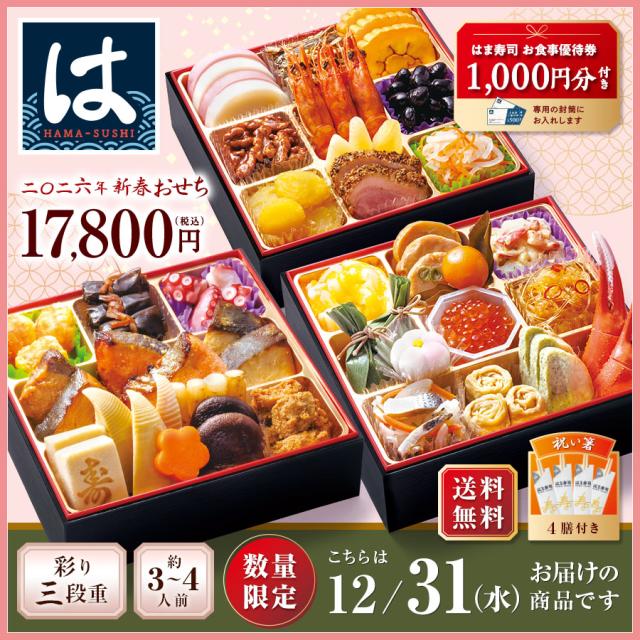 2026年 はま寿司の新春おせち 彩り三段重 約3-4人前【12/31にお届け】【送料無料】【時間・日付指定不可】【同梱不可】【予約】