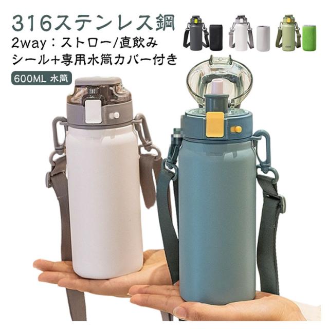 男の子 保温 600ML おしゃれ 子供用 2way キッズ 直飲み ショルダー 316ステンレス 保冷 ストロー 小学生 女の子 アウトドア スポーツ 水筒 専用水筒カバー付き 中学生 大容量 ダイレクトボトル マグボトル ワンタッチ