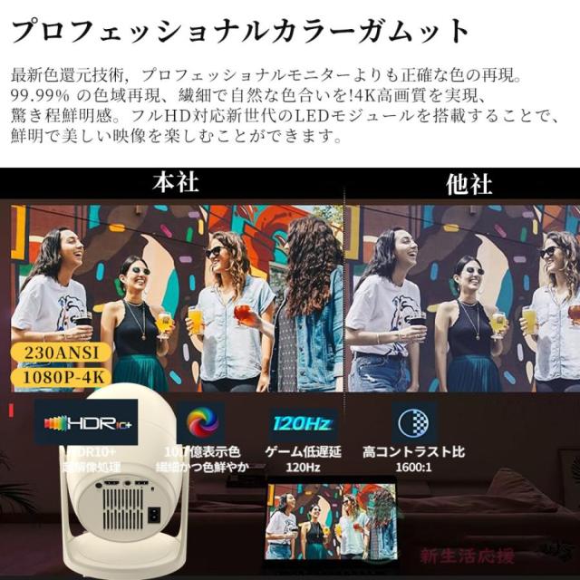 プロジェクターは、超高速5G&2.4Gと先進のWi-Fi6技術を搭載しており、遅延を最大60%削減されて、より高速で安定したインターネット接続を実現します。Wi-Fi経由でiOS、AndroidおよびWindowsデバイスを素早く接続でき、超スムーズで遅延のないオンラインゲーム、映画鑑賞、ビデオ学習体験を簡単に楽しむことができます。また、Bluetooth5.3も搭載し、ご愛用のスピーカーやワイヤレスイヤホンやから音声を流すことができ、迫力ある映像をこだわりの音響環境で映画館のような雰囲気を楽しむことができます。